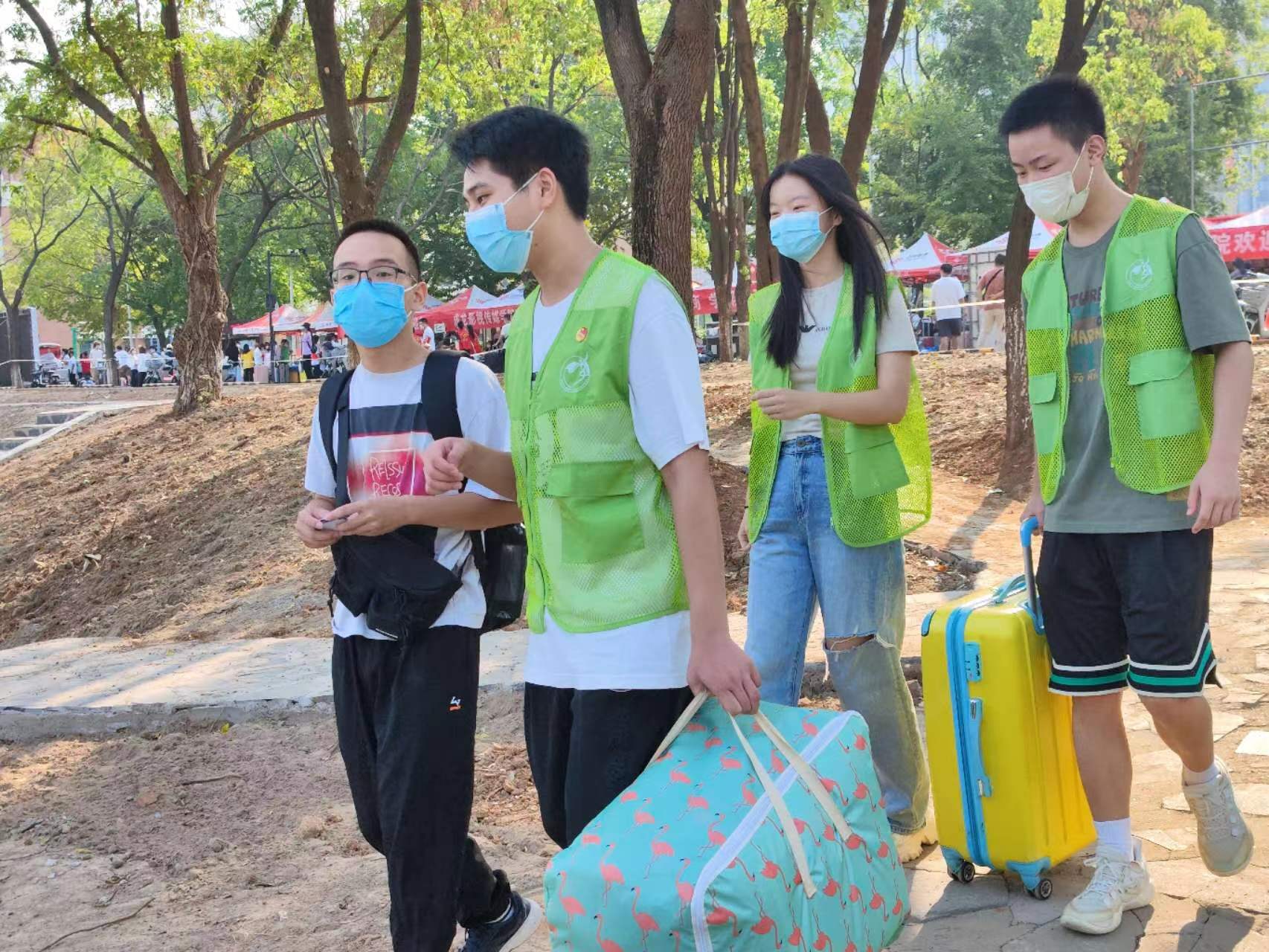公司在2、5、6号宿舍楼下安排了员工党员志愿者,在因疫情防控家长无法入校之际,帮助新生将行李运送上楼。