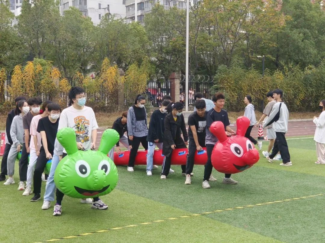 趣味比赛令人回味:毛毛虫竞赛、团体长杆跑,三足鼎立,袋鼠运瓜、拔河、集体跳绳。毛毛虫竞赛中,选手们步调一致,喊着“1212......”有序的一鼓作气冲向终点,诠释了团结合作的内涵,映射出同学之间的信任。袋鼠运瓜中,选手们穿上可爱的袋鼠服一蹦一跳完成球的接力。比赛途中,旁边呐喊的同学也很卖力,大家在激烈且欢乐的氛围下完成了比赛。