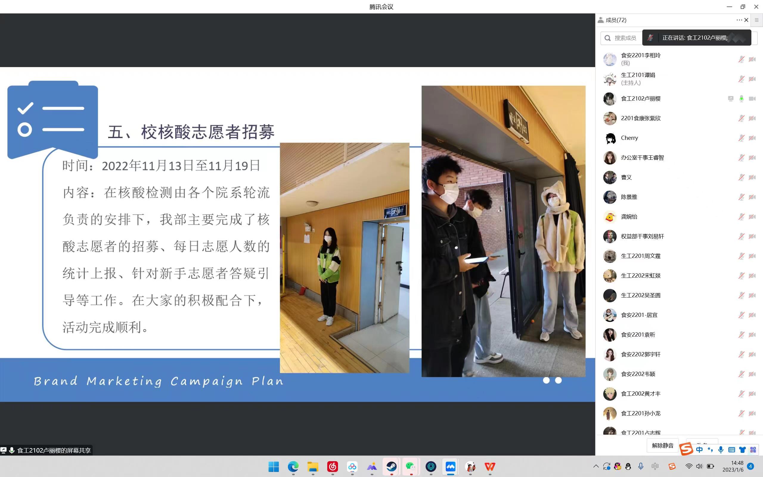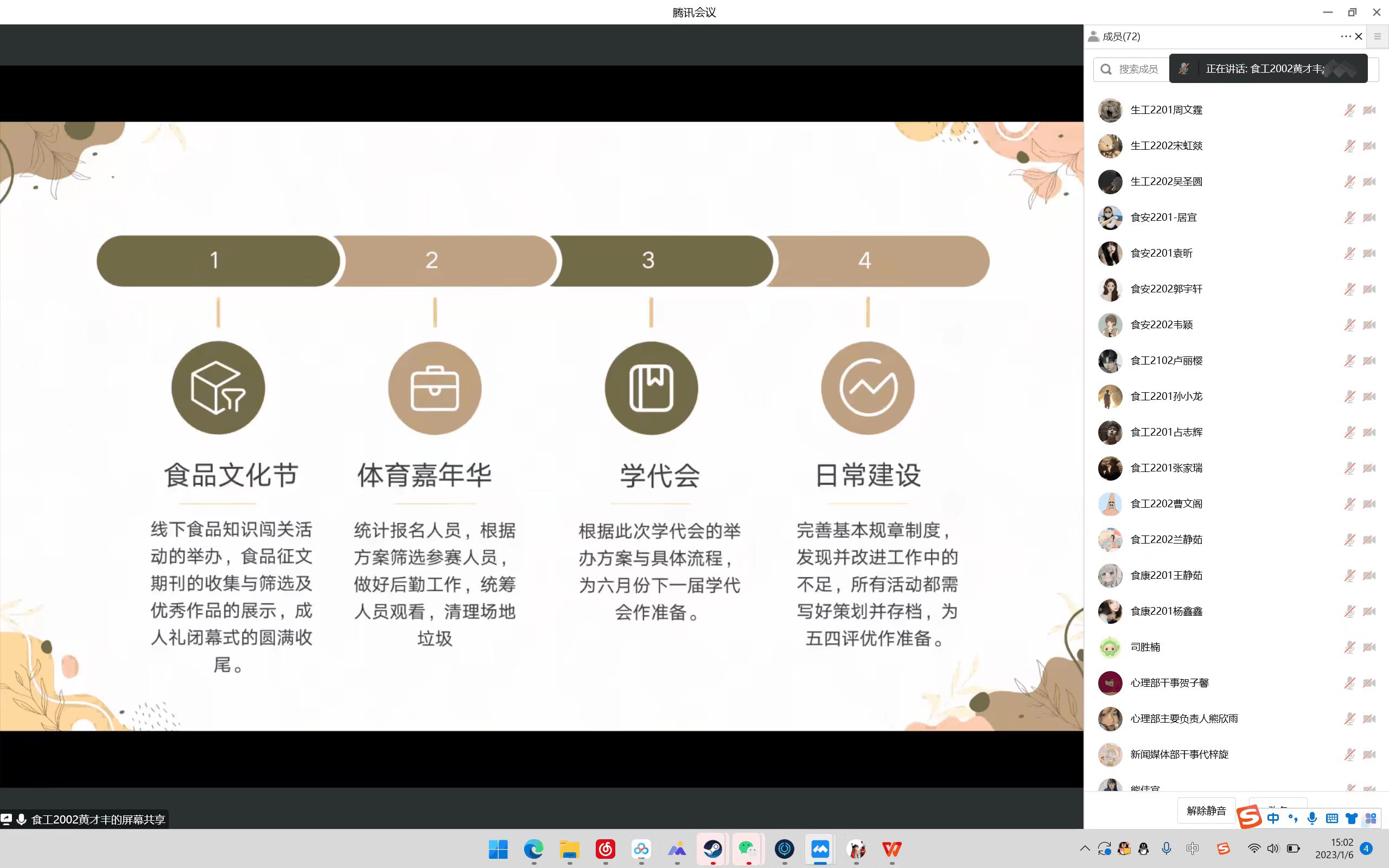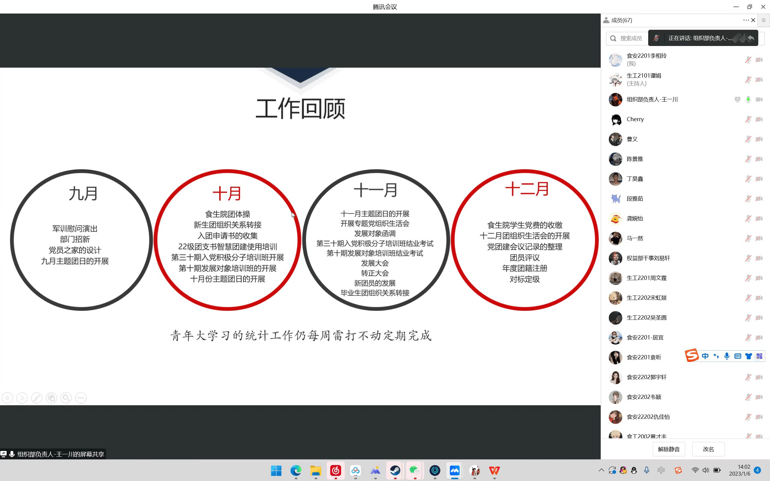 (通讯员 兰静茹 李相玲)为了总结回顾本学期员工会的各项工作,进一步开展和落实新学期的工作任务。公司于1月6号14:00以线上方式召开了2022-2023-1学年第一学期分团委员工会述职评议大会。参加本次会议的主要有分团委负责人张智、21级辅导员朱广寿、22级辅导员龚婉怡及分团委员工会全体成员,此次会议由员工会办公室工作人员袁昕主持,由分团委员工兼职副书记、主席团成员及各部门主要负责人对本年度的工作进行总结。
