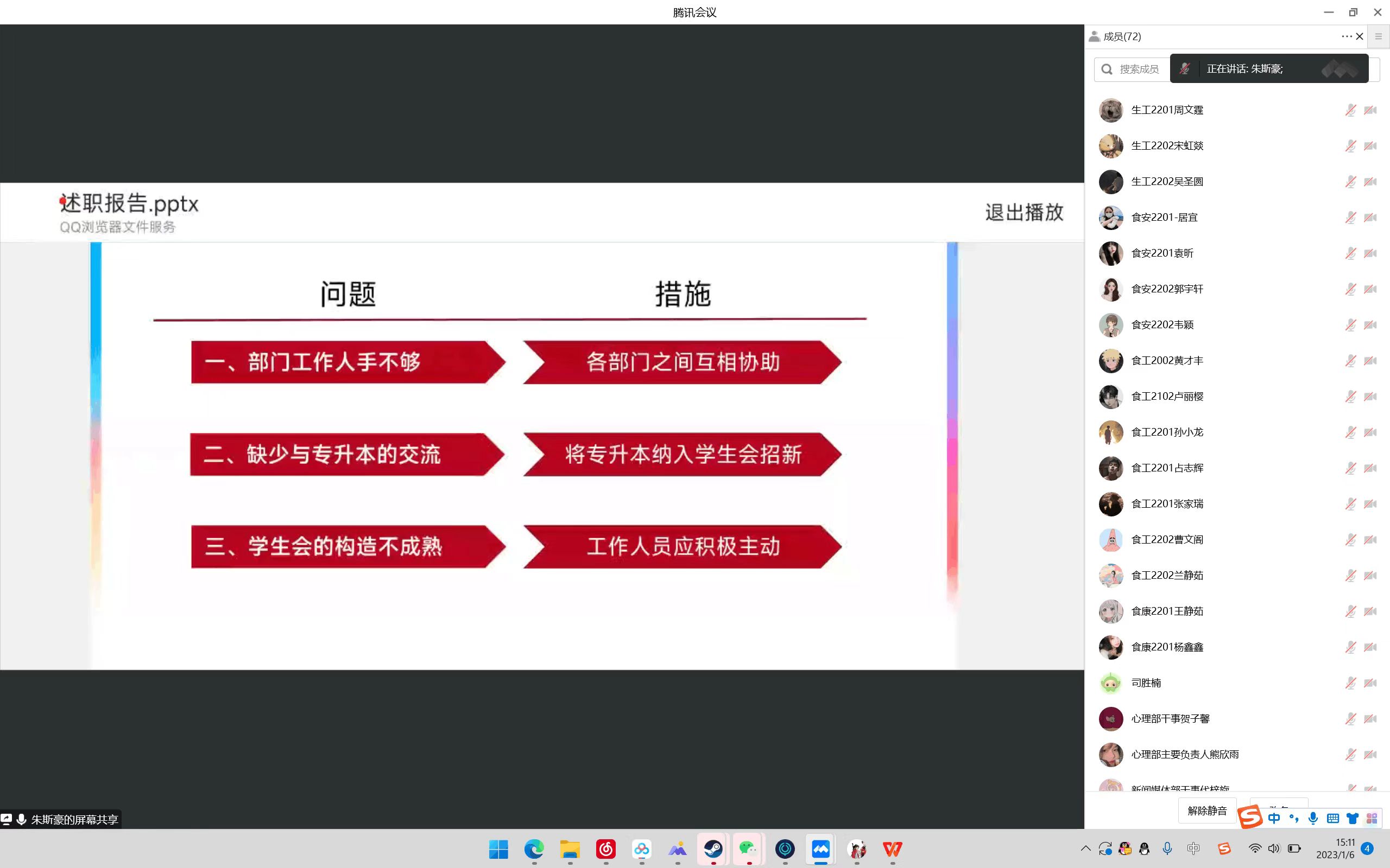 首先,各部门主要负责人依次进行述职汇报,分别从工作回顾、完成情况、不足与改进及未来计划四个方面进行汇报。脉络清晰,内容详实,充分展现出员工组织的活力与创造力。其次,分团委员工兼职副书记郑雪莲发言。她对分团委各部门的发言进行总结,也对接下来的工作提出了要求:尽可能“沉下来工作”,加强部门的联系,工作更细心等等。紧接着,由主席团成员进行述职汇报,总结工作上取得的成绩与不足,提出改进的措施与工作计划,并表示要充分发挥员工干部的模范带头作用,冲锋在前,彰显青春底色。