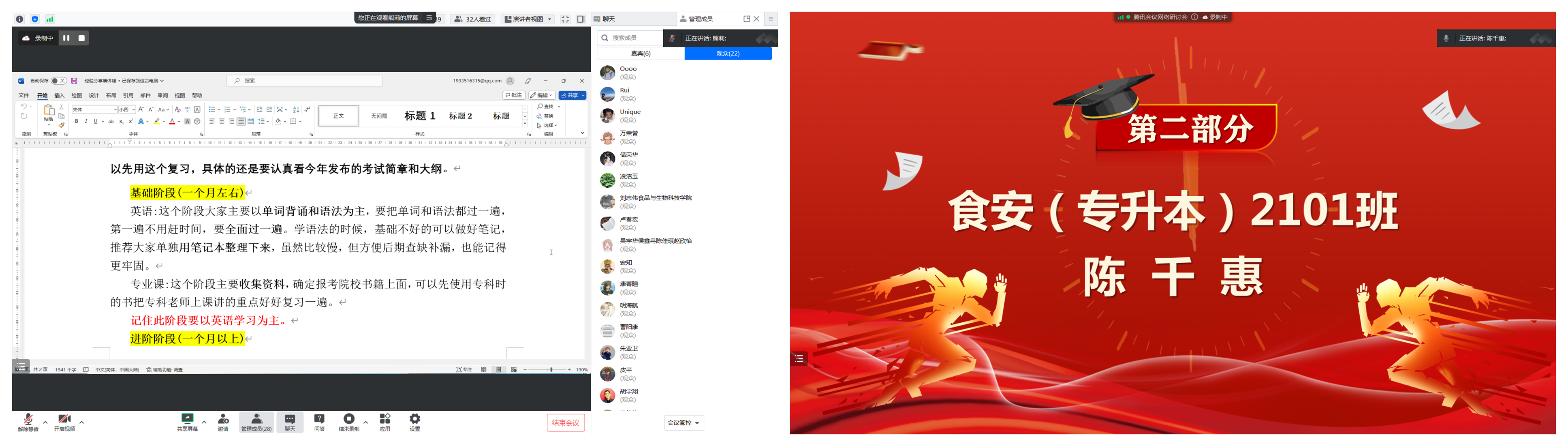 张智首先给大家介绍了食卫专业员工升本意向统计的结果及省内各个高校食品专业升本录取率,随后两位学姐嘉宾结合她们的备考经历,依次在专升本时间安排、备考技巧、备考策略和调剂经验等方面向学弟学妹们进行了经验分享。