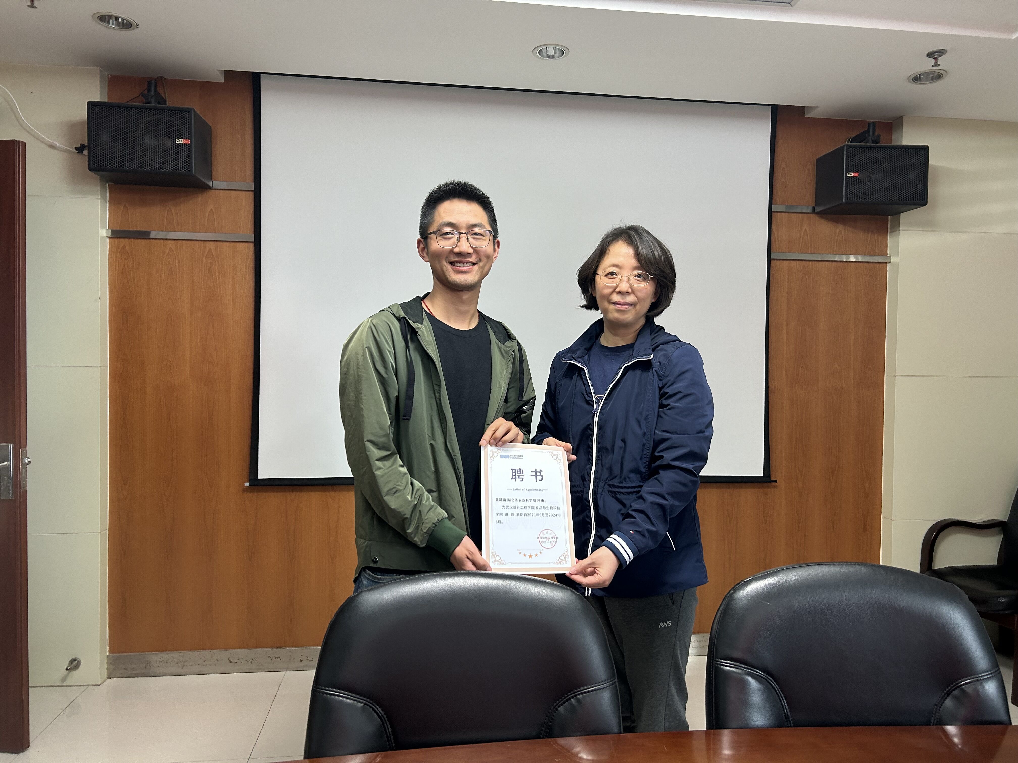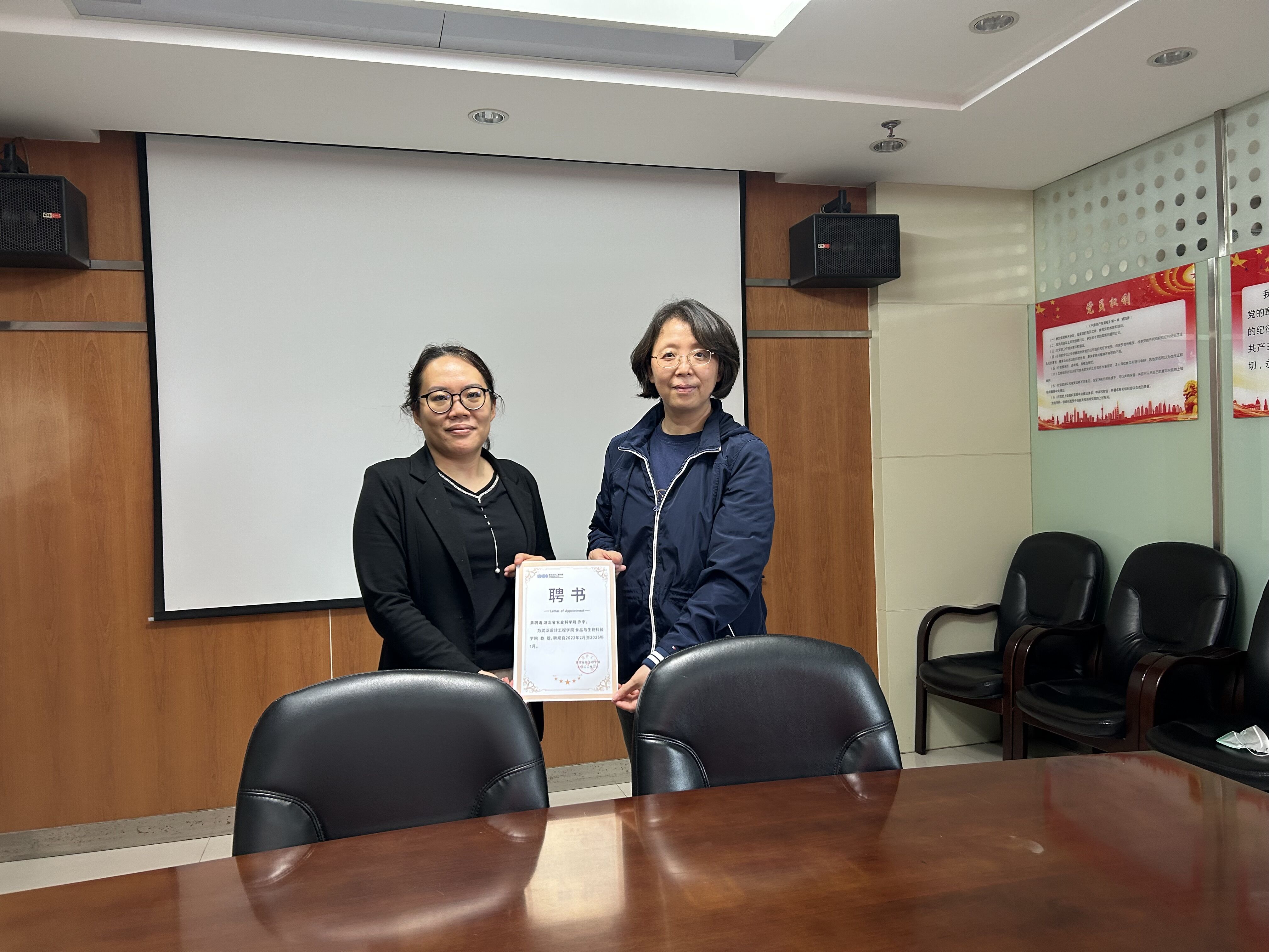 李文芳一行首先看望了正在实习的员工后在会议室进行了座谈。李文芳首先介绍了我们此行的目的,她表示,食生院和农产品加工所自2017年以来合作多年,校所合作方面取得较好成绩。希望双方在原有合作的基础上,进一步拓展合作领域和合作模式,在专业建设、课程设置、导师聘用等方面加强合作,不断拓展合作的深度、广度和力度,实现校所共赢、共同发展。会上,李书记分别为汪兰、乔宇、梅新、隋勇四位导师颁发了聘书。