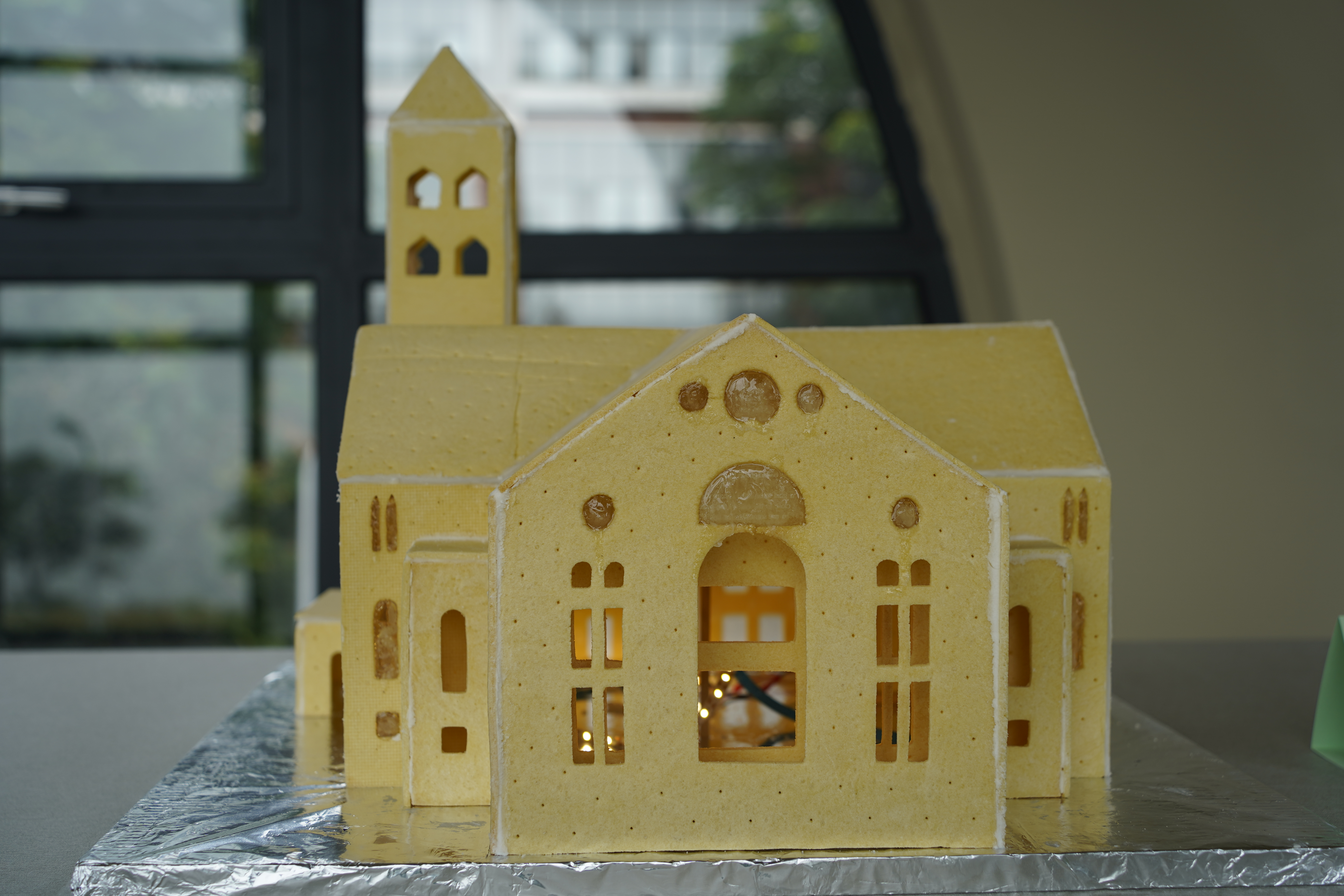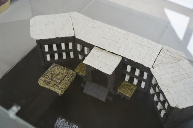 本次作品分为四个系列,一是“武设校园”系列,作品以公司得一堂、图书馆、人工湖等建筑为灵感来源,以巧克力、饼干、艾素糖为原料,创作出我的得一堂、图书馆姜饼屋、五色湖光微景观等作品。