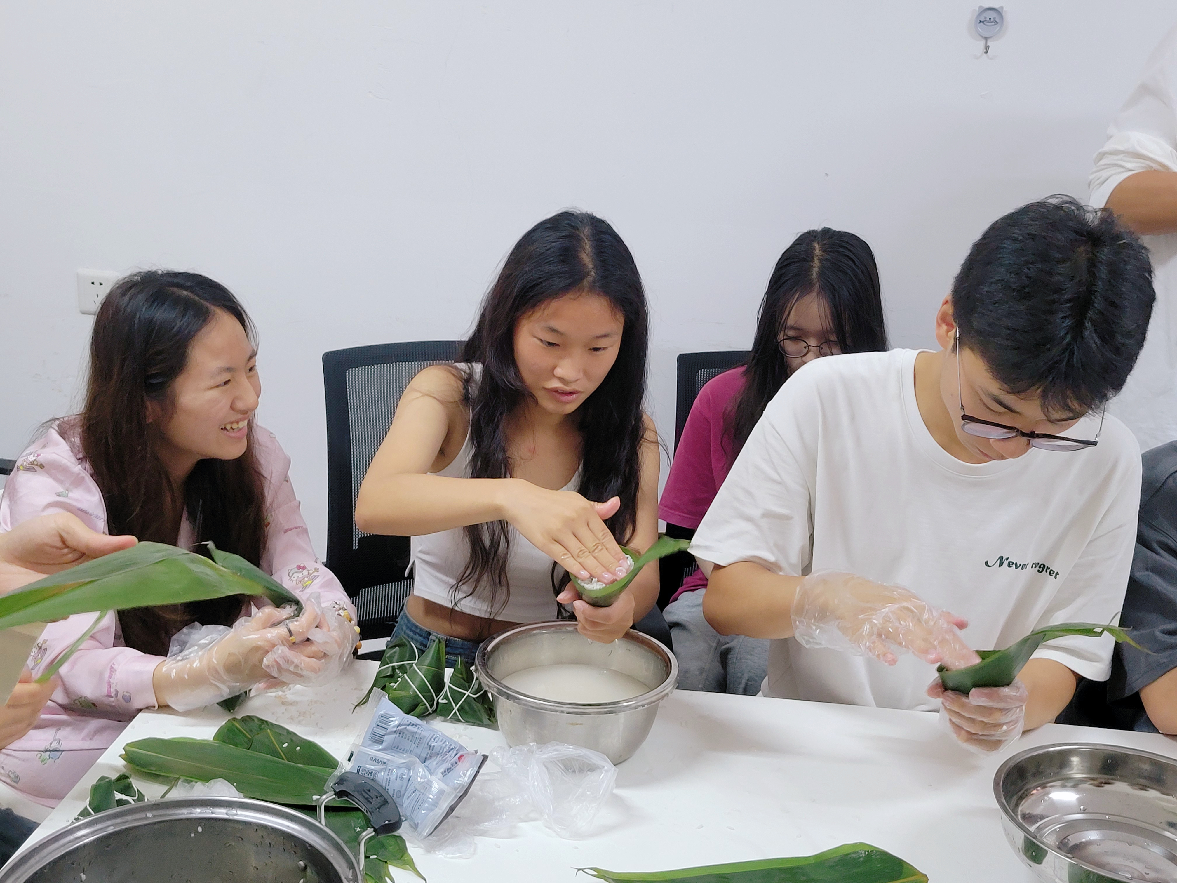 在老师展示完粽子的包法以后,同学们各自领取粽叶,迫不及待地开始尝试,摸索如何将粽叶折叠成锥形,如何将糯米及其他馅料如花生、蜜枣或红豆沙填入粽叶中,以及如何用绳子将其紧紧捆绑。活动中,参与的同学聚精会神享受着亲手制作粽子的乐趣。经过一番努力,一个个独特的粽子诞生了,它们或许形状各异,但每一个都承载着同学们的用心与端午节的传统意义。
