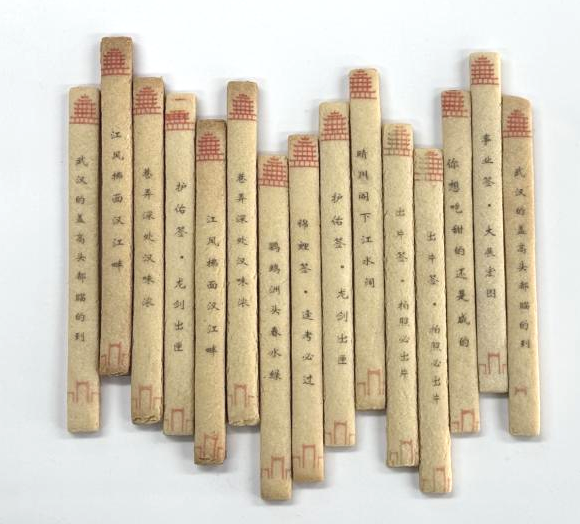 武汉印象上上签文创饼干以湖北云梦县国家宝藏“睡虎地秦简”为灵感,结合近年兴起的盲盒抽签、养生保健风潮及武汉文旅IP进行设计,并体现了地域饮食文化。饼干中添加莲子、藕粉、山药、板栗等湖北特色原料作为功能成分,饼干上呈现文字内容从武汉俚语、武汉文化、祝福语、减压、励志、赋能等方面进行设计与选取,通过“抽签”形式,消费者拿取食用时能体验到抽签的乐趣,集营养、保健、美味、特色于一体,共分为“客哪玩”“七莫斯”“看看云奇”三个系列。