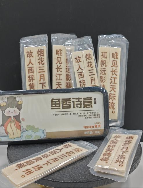 鱼香诗意鱼面是以湖北特产“云梦鱼面”为灵感研发创作的一款融合美味与荆楚文化的面条,定位为湖北特色旅游伴手礼。产品以优质草鱼鱼糜和面粉为主料增加蛋白质含量,面条表面用酱油印制经典古诗《黄鹤楼送孟浩然之广陵》,凸显荆楚文化魅力。产品简化了传统鱼面制作工艺,干制储藏,常温流通,方便携带馈赠亲友。古诗鱼面将“鱼+面+古诗”融为一体,将美味、营养与文化完美融合,是荆楚文化传承载体,面里有鱼,面中有诗,面外有情,可作为传递情感、分享文化的好物。