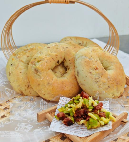 啤酒贝果带来全新味觉盛宴!葡萄乳酪馅的,内藏甜蜜惊喜。新鲜葡萄与浓郁乳酪相互交融,酸甜果香与醇厚奶香完美搭配,每一口都似味蕾在云端起舞。而贡菜芝士腊肠味道更具特色,贡菜的爽脆、芝士的浓郁、腊肠的咸香交织在一起,层次丰富得如同梦幻乐章。经啤酒发酵的贝果外皮麦香独特,松软又嚼劲十足,与馅料相得益彰。无论是早餐时刻还是下午茶,它们都是绝佳选择。