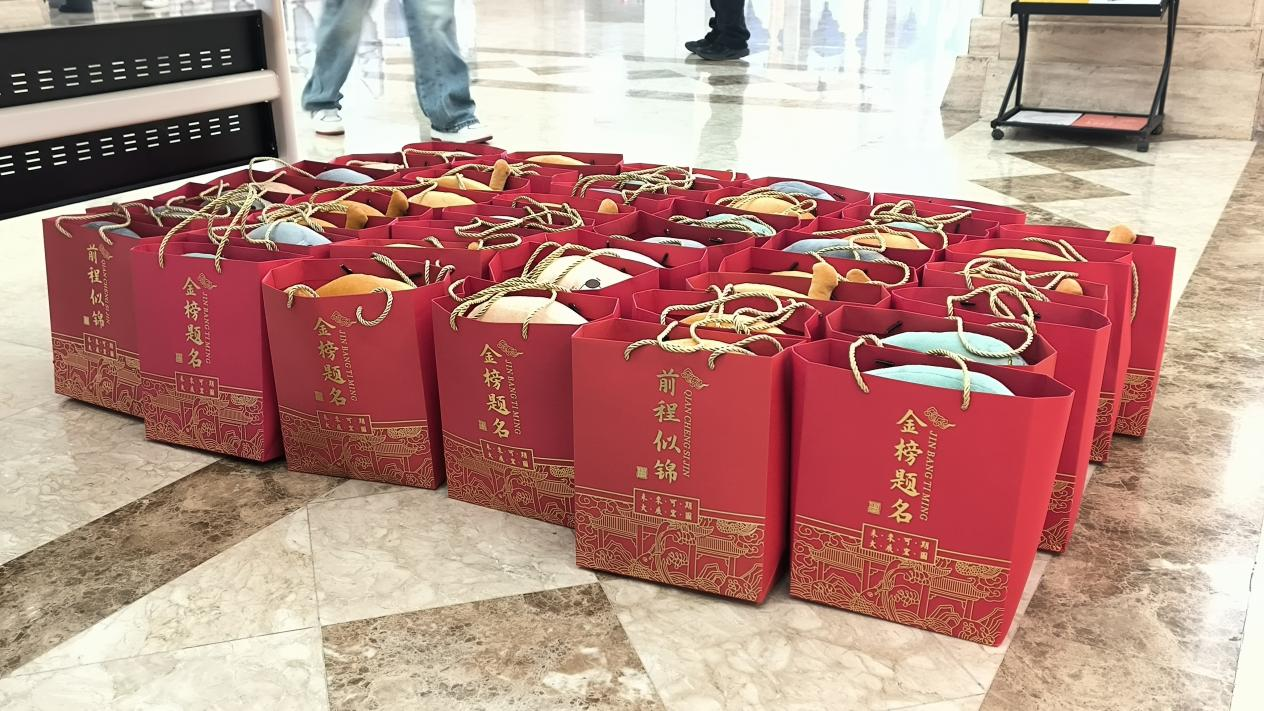 随后,公司领导和老师们携院学科部全体成员为考研学子们送上了精心准备的暖心“加油包”。这些红色礼袋上印有“金榜题名”“前程似锦”等美好寓意,内部则装有寓意“心想事橙”的橙子、定制款加油可乐和U型枕等实用物品。这些礼物不仅传递了公司对考研学子们的深切关怀和美好祝愿,也为大家提供了实实在在的帮助和支持。