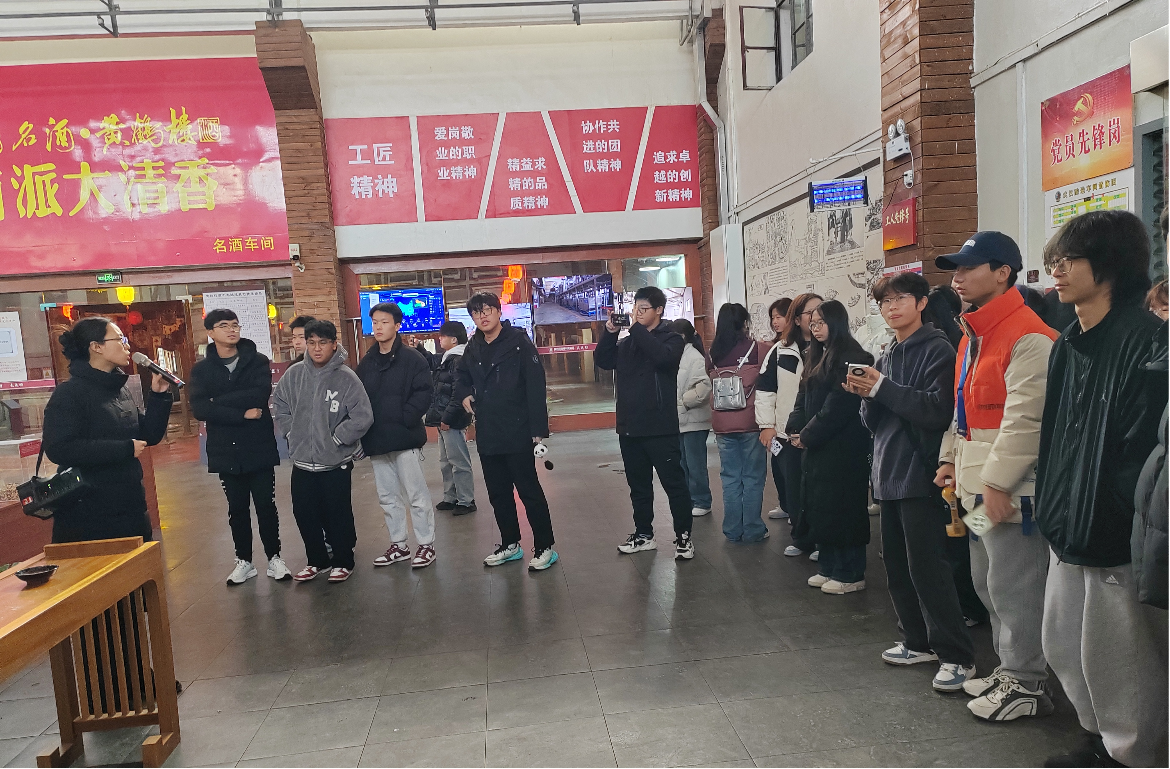 师生们下车后就列队跟随实习参观讲解员在公司主干道上参观黄鹤楼酒业辉宏的内部建筑,包括党建博物馆、发酵生产中心、存储中心等。紧接着我们来到发酵生产中心,一阵阵浓郁的酒香扑鼻而来,同学们纷纷感叹道“好香”。只见在热气腾腾的烟雾缭绕中,工人们正在翻动酒糟,旁边的大型设备正在繁忙地工作。参观讲解员带着我们从发酵中心到储存中心,亲眼见证了黄鹤楼酒从原料筛选到酿造、陈化的全过程。