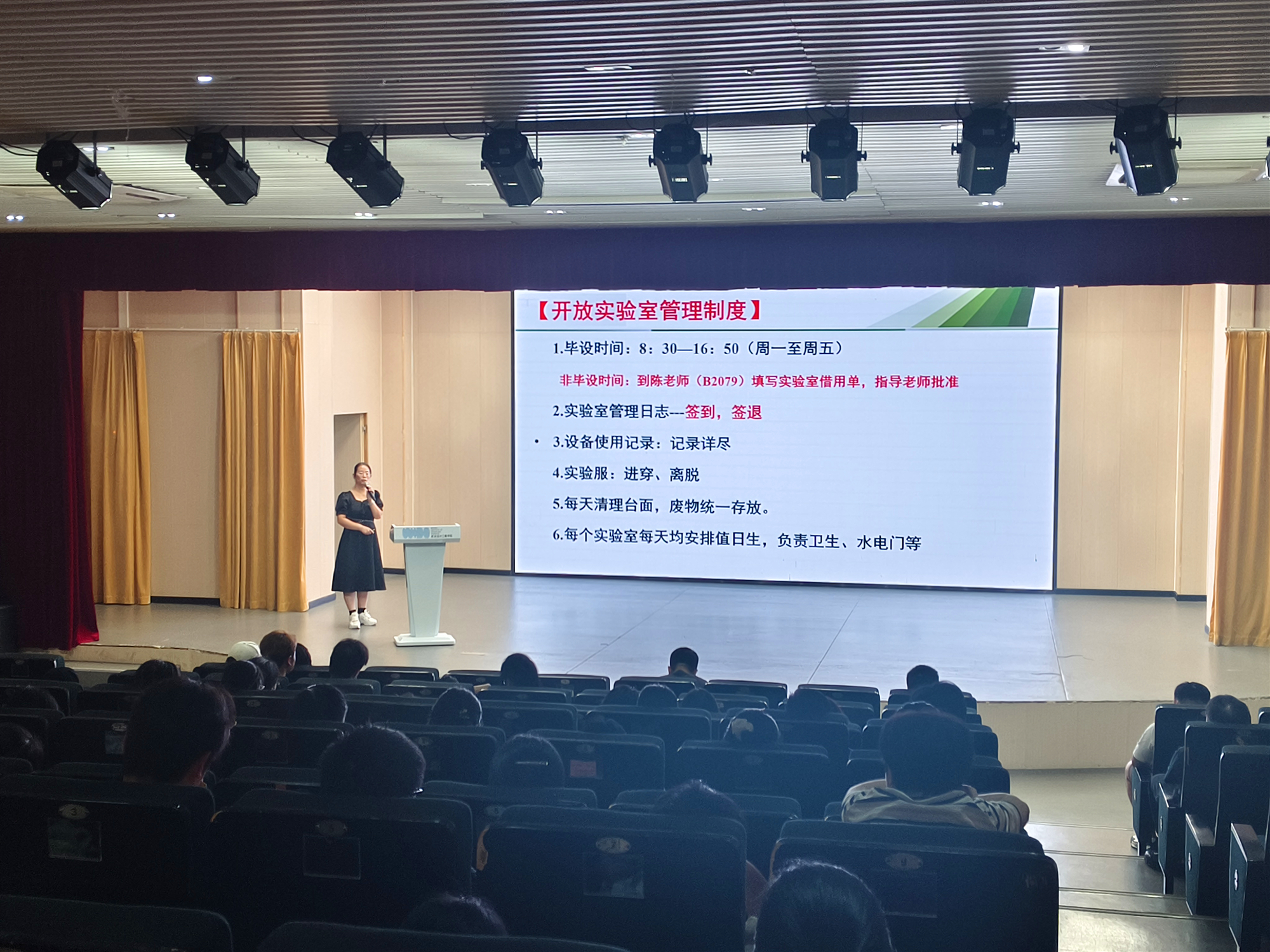 翟淑红则针对毕业论文涉及的实验室使用,讲解“实验室管理规范”。她从实验安全、设备使用、数据记录、环境卫生四方面提出要求:强调实验操作需严格遵守安全规程,危化品使用需提前报备;明确设备使用前需确认状态、使用后需做好登记;要求实验数据需实时、准确记录,避免后期补填;提醒员工实验结束后需清理台面、规整试剂,共同维护实验室秩序,为毕业论文实验环节筑牢安全与规范基础。