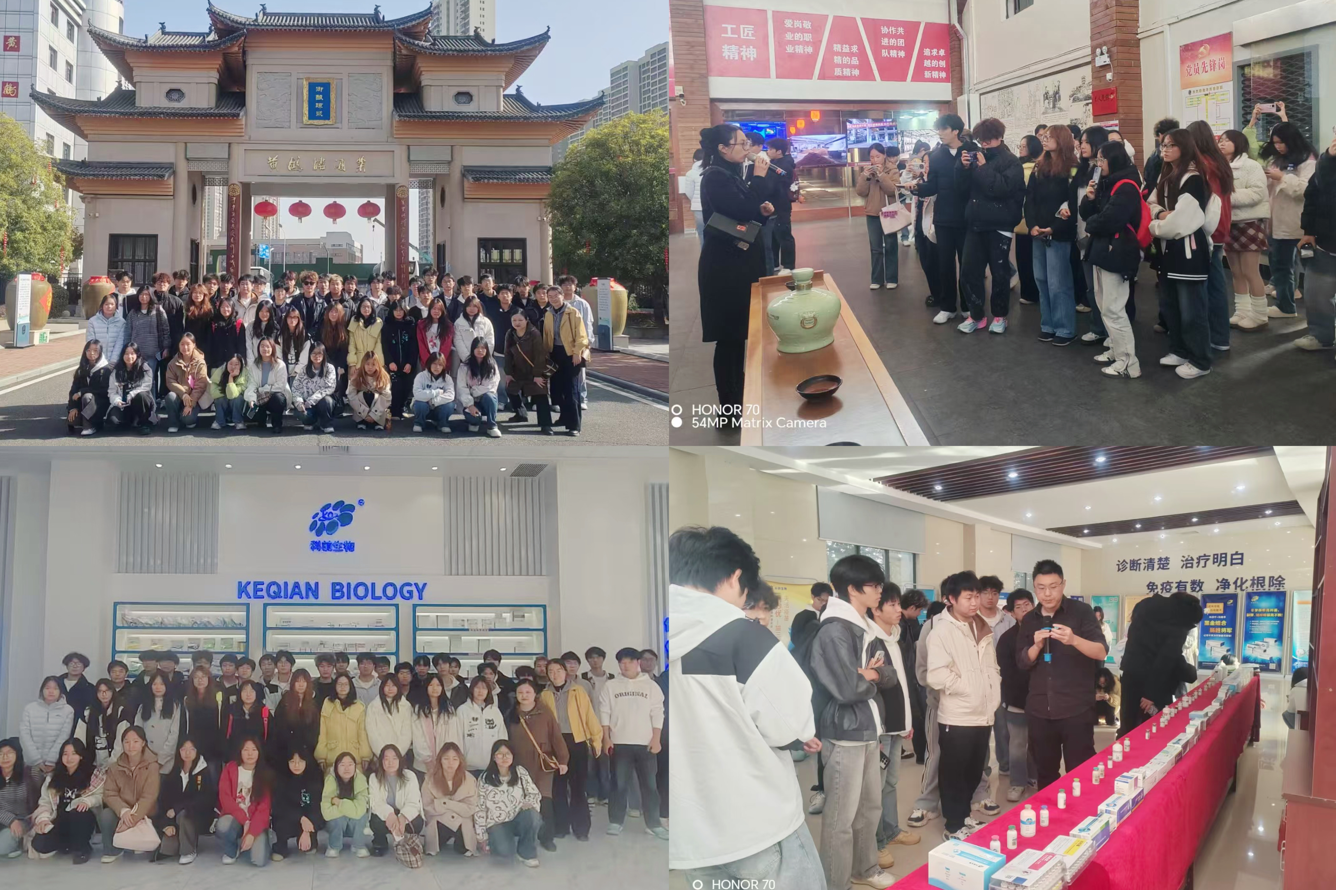 生物工程系的同学们则体验了一场从传统工艺到现代生物医药的跨界之旅。在黄鹤楼酒业,同学们漫步于企业文化长廊,参观党建博物馆、发酵生产中心、基酒存储库与文化博物馆,领略了千年酿酒技艺与现代生物发酵技术融合的魅力,理解了微生物在传统产业升级中的核心作用。在发酵生产中心,他们深入了解了酿酒微生物(如曲霉、酵母菌)的选育、培养与发酵过程控制,热烈探讨了现代生物技术如何优化传统酿造工艺、提升产率与风味。这次参观将课堂所学的知识与历史悠久的酿造产业紧密结合,彰显了生物工程技术的转化价值。