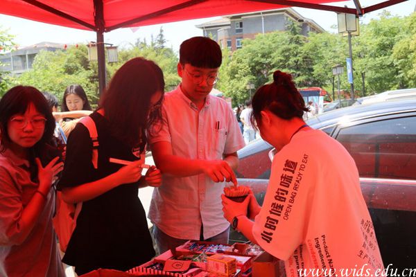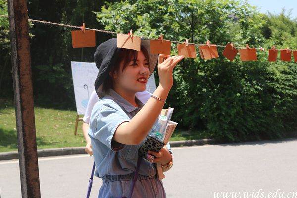 24日中午人工湖对面围满了参与活动玩游戏的同学。他们从绳子上摘下写有各种字谜的纸片, 认真思索答案,冲破“心心解谜”的迷惑。“丝带传情”寄托对美好生活的祝愿,参与者在卡片上写下祝福,或是希望父母康健、学业有成、或是与室友和朋友之间友谊长存等等心灵寄语。“幸运大白鲨”考验参与者的敏捷度,当参与者按倒让大鲨鱼的闭口的按钮就代表游戏结束。