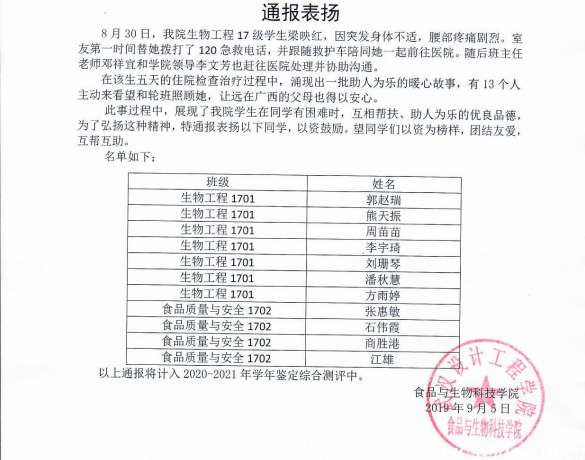 这个女孩名叫梁映红,是公司生物工程17级的员工。她在吃早饭的时候,突发身体不适,腰部疼痛剧烈,浑身不能动弹。她的室友张惠敏、江雄得知后及时替她拨打了120急救电话,并跟随救护车陪同她一起前往医院。经意愿检查诊断需住院治疗。因梁映红家住广西,父母不方便赶到医院照顾,同学们了该生情况后,主动申请到医院轮班照顾。经过五天的住院检查治疗后,梁映红的病情有所好转,在同学的陪同下办理出院并返校。