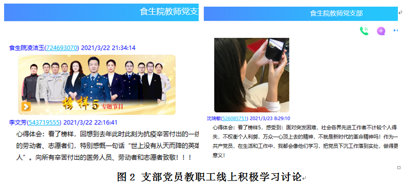 教工党员们线下认真收看,线上积极学习讨论,依托食生院教师党支部QQ群交流讨论,发布学习心得。党总支李文芳副书记说到:“看了榜样,回想到去年此时此刻为抗疫辛苦付出的一线医务人员和各行各业的劳动者、志愿者们,特别感慨一句话世上没有从天而降的英雄,只有挺身而出的凡人。向所有辛苦付出的医务人员、劳动者和志愿者致敬!”支部书记罗璇老师谈到:“中共的抗疫显示了我们党的制度优势和全体党员的初心使命,党组织就是一座坚挺的战“疫”堡垒,是全国各地的党员都团结一心共同抗击疫情才获得了伟大的胜利。”沈瑞敏老师表示:“看了榜样5,感受到了面对突发困难,社会各界先进工作者不计较个人得失,不权衡个人利弊,万众一心顶上去的精神,这不就是新时代的革命精神吗!作为一名共产党员,在生活和工作中,我都会像他们学习,把党员下沉工作落到实处,做得更有意义!”