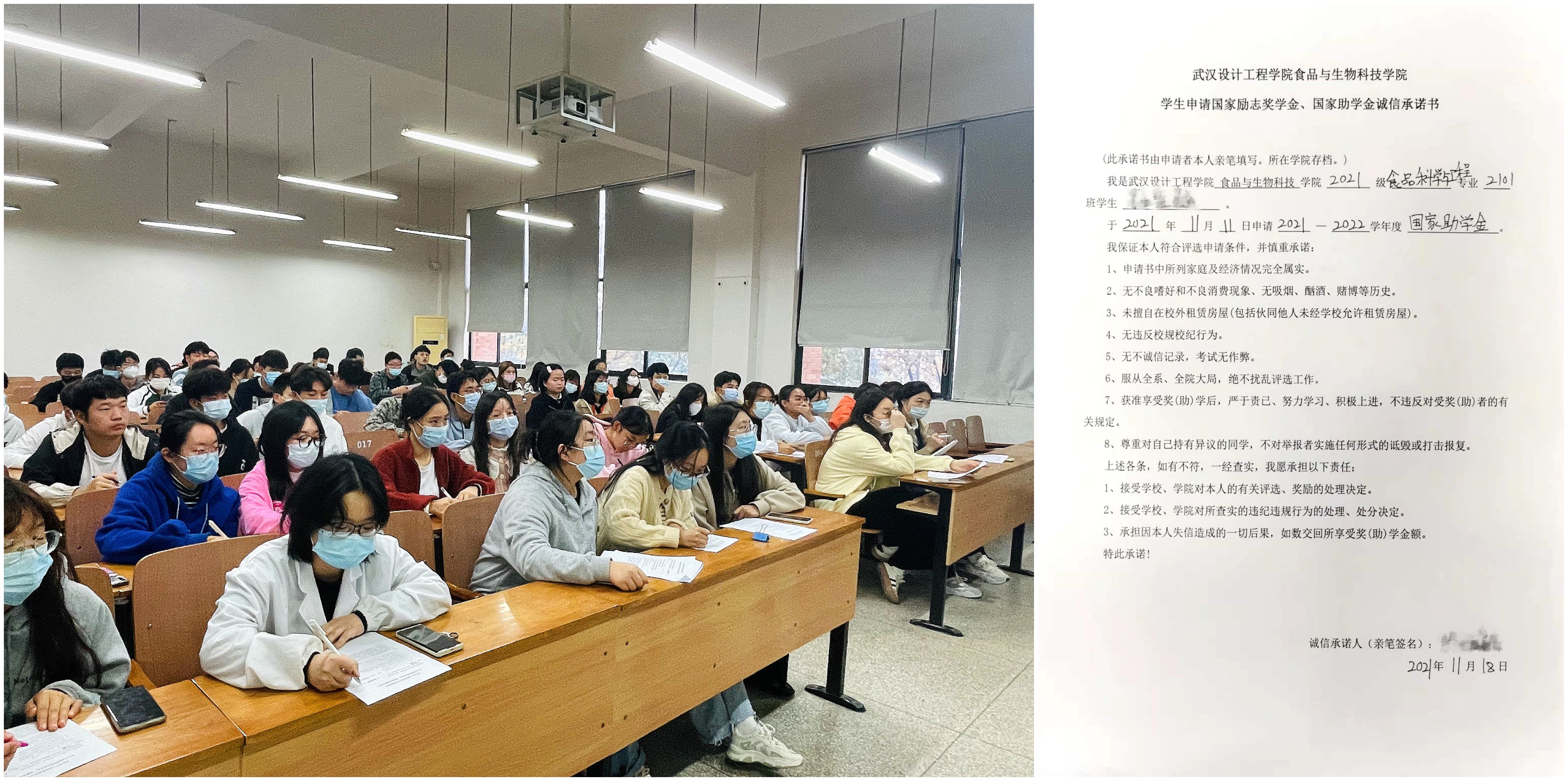 会上张智老师简述了国家励志奖学金、国家助学金此项工作的重要性,从老员工践行社会主义核心价值观的角度,对做好励志奖学金、助学金诚信建设的重要意义进行了深入讲解,呼吁全体参评同学用实际行动践行诚信并塑造老员工的良好社会形象。诚信承诺书中强调了诚信参评的重要性,并明确了每位获得国家资助的同学应有的决心和态度,仪式过程中,同学们认真阅读承诺书,并庄重严肃签下自己的姓名。
