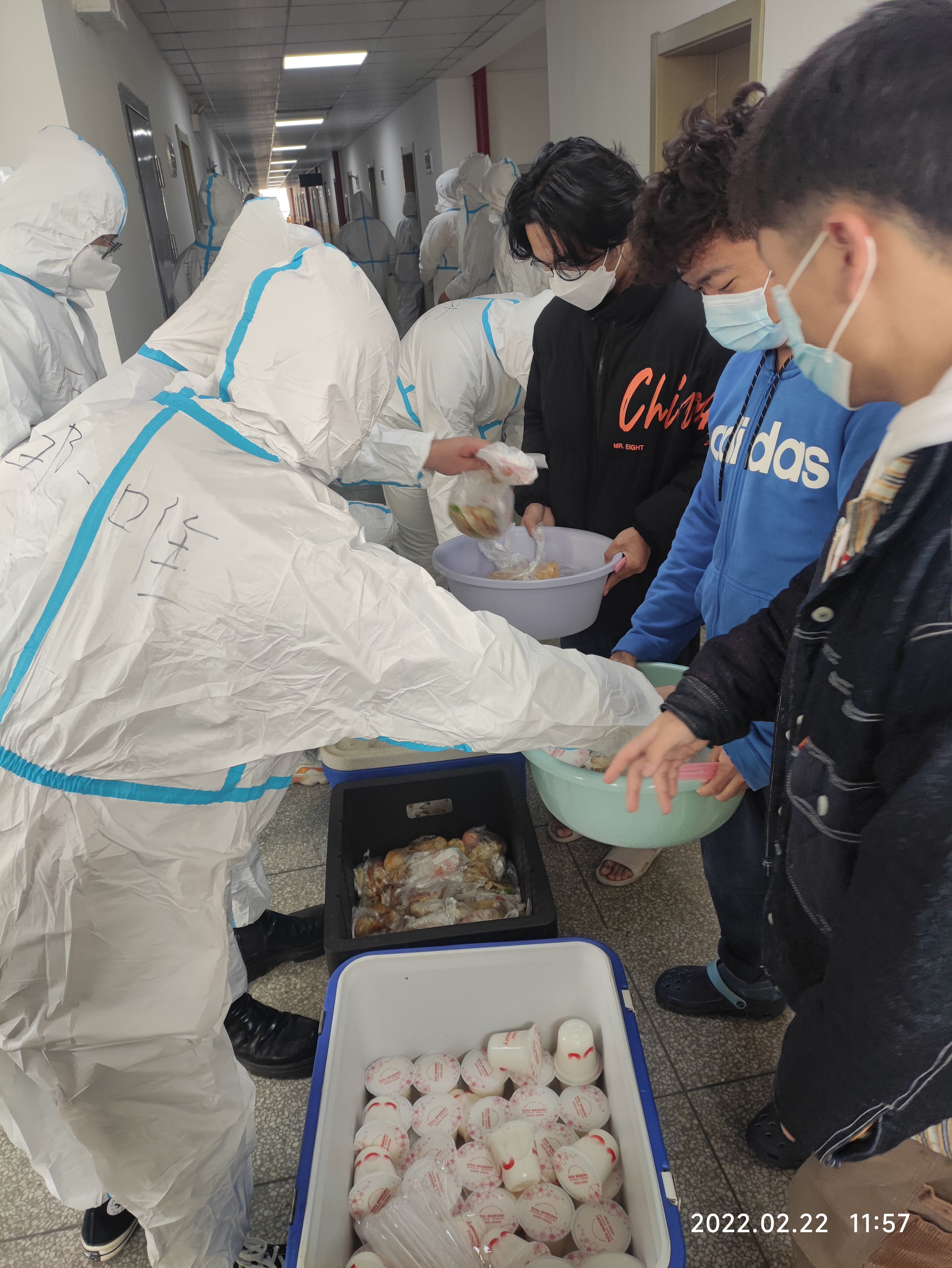 第二天一早在食堂准备为风控管理的寝室楼配送早餐的时候,公司辅导员迅速进行了现场志愿者的招募,正在食堂准备就餐的同学看到自己的辅导员在现场组织,立即就自发加入到了送餐队伍,就地换上了防护服,在辅导员老师的组织下,迅速有序的开始了工作,从招募志愿者到餐食送入寝室同学手中,仅仅只用了几分钟时间。